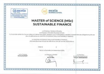 学位全球认可,国家权威认证 - 本项目是经中华人民共和国教育部正式批准的中外合作办学硕士学位教育项目,满足学位要求的学生将获得法国 Excelia 商学院颁发的"可持续金融"理学硕士学位证书,证书与出国留学所获学位证书相同,并可取得中国教育部权威认证。